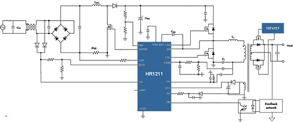 MPS AC/DC的另一款成名之作HR1211,也充分地體現(xiàn)了MPS的產(chǎn)品優(yōu)勢(shì),這是一款集成多模式PFC和電流型LLC的二合一控制器。芯片集成了高壓電流源、安規(guī)認(rèn)證的X電容放電電路、PFC和LLC的高壓驅(qū)動(dòng)電路,從而實(shí)現(xiàn)了非常簡(jiǎn)潔的外圍電路。
