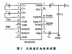 通過串口驅(qū)動(dòng)電路中的RS 232電平轉(zhuǎn)換芯片,可以實(shí)現(xiàn)單片機(jī)和PC機(jī)之間的通信,建立人-機(jī)對(duì)話活動(dòng)的通道。桑銳公司生產(chǎn)的SRWF-1型無(wú)線通信模塊工作性能穩(wěn)定,體積小便于安裝。利用MAX3232芯片,能夠完成TTL電平和RS 232電平之間的轉(zhuǎn)換,實(shí)現(xiàn)通信模塊與PC機(jī)進(jìn)行串口通信。其電路原理圖如圖5所示。