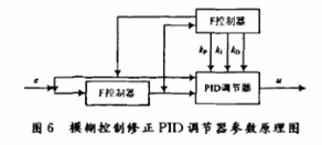 模糊PID控制器的原理是把輸入PID調(diào)節(jié)器的偏差e和偏差變化率ec同時(shí)輸入到模糊控制器中。圖中的F控制器實(shí)際上是由三個(gè)分模糊控制器組成的,分別對(duì)三個(gè)參數(shù)進(jìn)行調(diào)節(jié),然后分別經(jīng)過模糊化、近似推理和清晰化后,把得出的修正量分別輸入PID調(diào)節(jié)器中,對(duì)三個(gè)系數(shù)進(jìn)行實(shí)時(shí)在線修正,從而使被控對(duì)象具有良好的動(dòng)態(tài)和靜態(tài)性能。