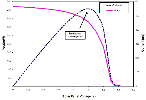 圖 1 輸出電流和輸出功率為雙節(jié)太陽能電池板電壓的函數(shù)