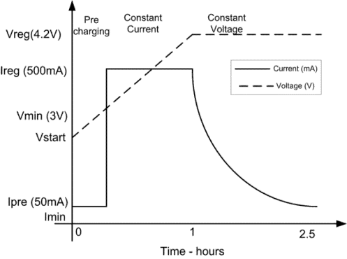 鋰離子電池充電要求對電池實施精確的電流和電壓控制,以確保電池電量充滿,防止縮短電池使用壽命,并防止在充電期間出現(xiàn)危險狀態(tài)。鋰離子電池充電的常見過程(請參見圖 3)可分為如下三個階段:預(yù)穩(wěn)壓、恒定電流充電和恒定電壓充電。