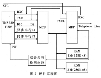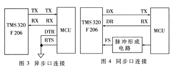 調(diào)制解調(diào)器采用異步連接同步傳輸?shù)墓ぷ鞣绞,即在異步方式下進(jìn)行連接,建立連接后進(jìn)入同步傳輸狀態(tài)。由于TMS320F206及MCU都為TTL電平,故它們之間可直接相連。異步串行口及同步串行口具體連線見圖3和圖4。