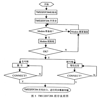 系統(tǒng)工作流程如下:系統(tǒng)上電復(fù)位后,TMS320F206首先進(jìn)行初始化,打開異步口,然后檢測(cè)調(diào)制解調(diào)器是否準(zhǔn)備好。若沒準(zhǔn)備好,則對(duì)調(diào)制解調(diào)器再次復(fù)位;若準(zhǔn)備好,則送AT命令進(jìn)入調(diào)制解調(diào)器?對(duì)調(diào)制解調(diào)器進(jìn)行初始化。即使能調(diào)制解調(diào)器同步口,將調(diào)制解調(diào)器設(shè)置為異步連接同步傳輸方式,采用外部時(shí)鐘以及對(duì)同步傳輸模式、傳輸速率等相關(guān)特性進(jìn)行設(shè)置。同時(shí)決定主叫端是否加上ATX1命令以及被叫端是采用何種應(yīng)答方式。調(diào)制解調(diào)器每次收到正確AT命令且正確進(jìn)行相應(yīng)操作后,會(huì)通過異步串口回送OK信號(hào)。因此,若TMS320F206收到OK信號(hào),就表明初始化成功。調(diào)制解調(diào)器初始化完成后,主叫端便撥號(hào)啟動(dòng)呼叫,被叫端進(jìn)入自動(dòng)應(yīng)答或偽自動(dòng)應(yīng)答過程。連通后,調(diào)制解調(diào)器會(huì)回送CONNECT信息給TMS320F206。此后TMS320F206便禁止異步口、打開同步口,開始進(jìn)行同步數(shù)據(jù)傳輸。