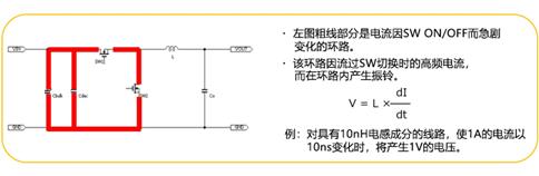 在開關(guān)時會產(chǎn)生急劇電流ON/OFF的環(huán)路中,會因寄生分量產(chǎn)生高頻振鈴=開關(guān)噪聲。