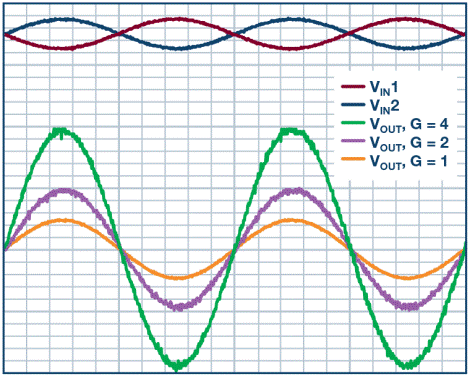 圖2顯示的是施加差分輸入電壓和電路增益變動的情況。RF值可設(shè)置系統(tǒng)增益。可以看到,這張圖顯示的是系統(tǒng)增益1、2和4,且1kHz時的差分輸入電壓為1Vp-p。