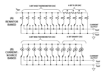 圖3:分段電流輸出DAC: (A)電阻方案;(B)電流源方案