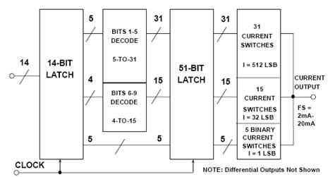 前5位(MSB)為完全解碼型,驅動31個同等權重的電流開關,各開關提供512