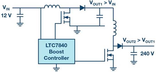 如果應(yīng)用中需要更高的升壓因數(shù),那么兩級式概念也是一種選擇。ADI的新型LTC7840在單芯片中包含兩個(gè)升壓控制器,可輕松實(shí)現(xiàn)兩級式升壓概念。圖3顯示了一個(gè)從12V電源電壓升壓至240V輸出電壓的例子。兩個(gè)升壓級可分步提升電壓,使每yi級僅需將電壓提升4.5倍左右。