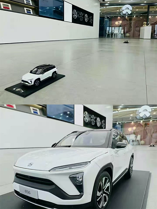 在四川省樂山市和眉山市的某家蔚來展廳,由于展車全部賣光,蔚來的銷售人員只得在展廳內(nèi)擺放蔚來的汽車模型來給顧客介紹車輛。