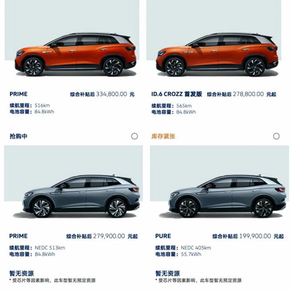 個(gè)月,不同的車型交付的時(shí)間有一定差別。值得注意的是,ID.4 CROZZ 的最低配和最高配車型均顯示受芯片等因素影響,此車型暫無預(yù)訂資源。