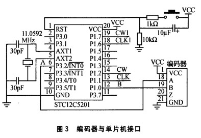 控制部分電路是以51單片機(jī)為控制核心,接收上位機(jī)的脈沖信號(hào)和方向信號(hào)CLK1和CW1經(jīng)過(guò)存儲(chǔ)處理后發(fā)送給驅(qū)動(dòng)電路部分驅(qū)動(dòng)步進(jìn)電機(jī)工作。另外,單片機(jī)還要實(shí)時(shí)接收來(lái)自旋轉(zhuǎn)編碼器的反饋脈沖信號(hào),對(duì)編碼器的兩相反饋脈沖信號(hào)進(jìn)行處理,判斷步進(jìn)電機(jī)的位置和旋轉(zhuǎn)方向是否與給定信息相符合,如果不相符就調(diào)用相應(yīng)的算法進(jìn)行自動(dòng)補(bǔ)償,最終使步進(jìn)電機(jī)達(dá)到預(yù)定的位置。由于旋轉(zhuǎn)編碼器的分辨率有高有低,如果選擇高分辨率的旋轉(zhuǎn)編碼器,在細(xì)分情況下,當(dāng)步進(jìn)電機(jī)在最高轉(zhuǎn)速時(shí),要求單片機(jī)的相應(yīng)速度要符合要求。本設(shè)計(jì)選用的單片機(jī)為宏晶科技的STC12C5201單片機(jī),1個(gè)時(shí)鐘/機(jī)器周期,增強(qiáng)型8051內(nèi)核,速度比普通8051快8~12倍。一般程序稍大的可選用STC12C5202或者STC12C5204。編碼器與STC12C5201的接口如圖3所示。