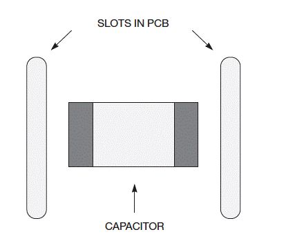 添加第二個(gè)電容器會(huì)增加成本,但不及將噪聲電容器替換為可能不會(huì)產(chǎn)生噪聲的電容器要多。Digi-Key的陶瓷電容器售價(jià)約為27美分(1000)。Kemet的KPS系列靜音部件的價(jià)格約為1.50美元。第二種方法涉及在PCB的電容器兩端附近制作一個(gè)插槽(圖2)。當(dāng)電容器膨脹和收縮時(shí),它僅使PCB的一小部分彎曲,這將減少噪聲。