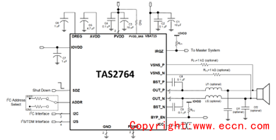 Up to eight TAS2764 devices can share a commonbus via I2S/TDM and I2C interfaces.