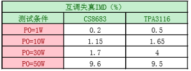 在削頂失真之前,CS8683 互調(diào)失真 IMD 比 TPA3116 小明顯。