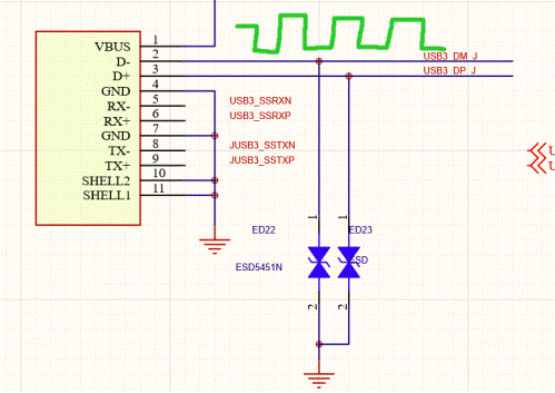 如上圖是我們在電路中最常見的處理靜電的防護(hù)電路,給接口器件添加esd進(jìn)行接地。