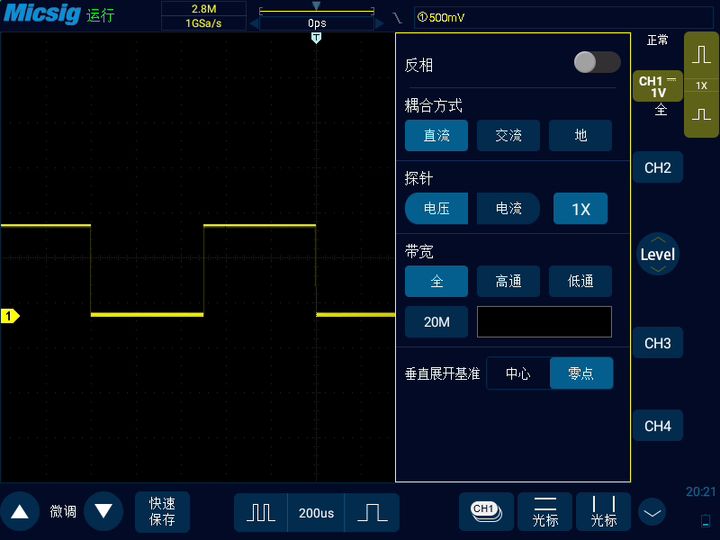 通過調節(jié)示波器的垂直檔位,可以放大和縮小波形在垂直方向上的形狀。比如,如果我們將垂直檔位設置為1V/格,而示波器垂直方向上有10格,那么示波器整屏幕最多可以顯示10V的波形。需要注意的是,這個數值同樣也和探頭的衰減比有關,如果我們使用的是10X的探頭,但是我們沒有調節(jié)示波器通道的衰減比(默認為1X),那么正確的讀數會和實際顯示的讀書相差10倍,因此在使用示波器的時候,也要注意探頭的衰減比,要將通道的衰減比和探頭的衰減比調成一致才可以。