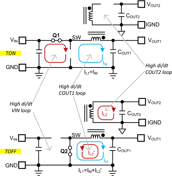 Fly-Buck 轉(zhuǎn)換器的一次側(cè)看上去與降壓轉(zhuǎn)換器類似,如圖 2 所示。這里的 VIN 環(huán)路與降壓轉(zhuǎn)換器一樣,也是高 di/dt 環(huán)路。然而,VOUT1 環(huán)路的電流與降壓轉(zhuǎn)換器有很大不同。除了一次電感器磁化電流外,該環(huán)路還包含來自二次繞組的反射電流。反射電流只含有其路徑中耦合電感器的漏電感,因此 di/dt 明顯高于電感器磁化電流。所以盡量減小 VOUT1 環(huán)路的環(huán)路面積也非常重要。同樣的道理,包含二次電感器繞組、整流器二極管以及二次輸出電容器的二次輸出環(huán)路也需要最小化,因?yàn)槔锩嬗懈?di/dt 電流流過。