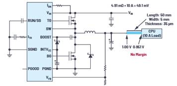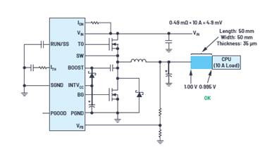 在這些數(shù)字系統(tǒng)中,有很多都使用高電流和低電壓,因此更需要盡可能縮短電源和負載之間的距離。高電流導致的一個明顯問題是,從轉換器到負載,線路產生的電壓會不斷下降。圖1和圖2顯示了電源和負載之間引線電阻的最小化如何使轉換器的輸出電壓降最小化——本例中是控制器IC和為CPU供電的MOSFET。
