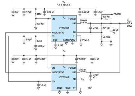 某些單片穩(wěn)壓器可通過多相并聯(lián)操作擴展到更高負載應用。圖12顯示了多個LTC3310S器件并聯(lián)并錯相工作,使得電流能力加倍。