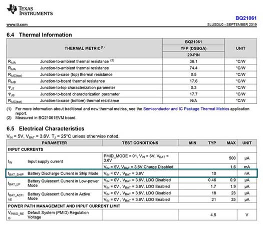 部分IC具有多種關(guān)斷狀態(tài),比如 TI的BQ25120電池充電器的2nA運(yùn)輸模式,或者 TPS61094 升壓轉(zhuǎn)換器的4nA旁路模式。在這些高級(jí)關(guān)斷狀態(tài)下,為了僅消耗極少量的靜態(tài)電流,通常會(huì)啟用非常有限的器件功能。與靜態(tài)電流為700nA的 BQ25120 高阻抗(關(guān)斷)模式和靜態(tài)電流為200nA 的TPS61094 關(guān)斷模式相比,運(yùn)輸節(jié)電模式和旁路模式可將電池運(yùn)行時(shí)間分別延長(zhǎng) 350 倍和 50 倍。