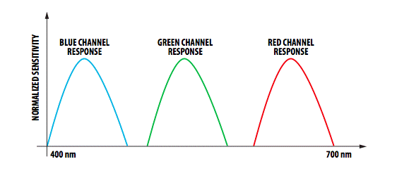 各個紅色,綠色和藍色通道的光譜響應應重疊,以確保捕獲所有波長信息。下面的圖1和圖2分別顯示了重疊和不重疊的頻譜響應。圖3顯示了從藍色表面反射的信號的任意光譜。