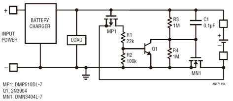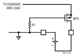 另一方面,如果充電器在電池附聯(lián)之前啟用,則 MP1 的柵極只需簡單地跟隨電池充電器輸出,因為它是由泄放電阻器 R2 上拉的。未接入電池時,MP1 根本沒有接通和使 MP2 脫離運行狀態(tài)的傾向。