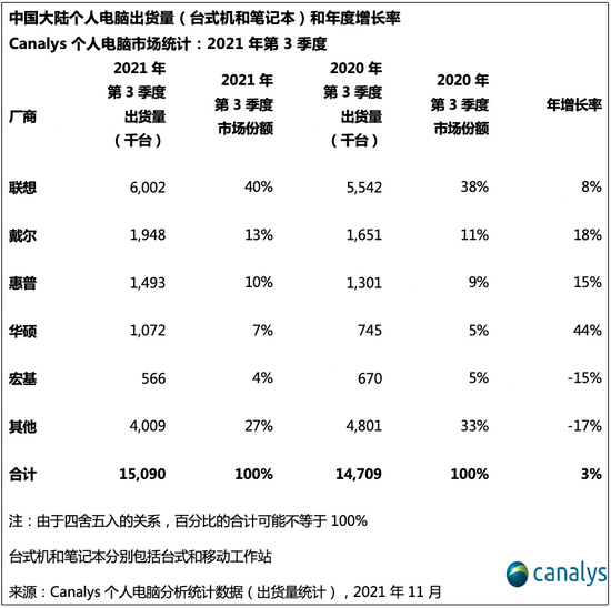 2021年第3季度臺式機(jī)和筆記本市場的前四名供應(yīng)商均實(shí)現(xiàn)了同比增長,反映了全球科技經(jīng)濟(jì)體蓬勃的發(fā)展勢頭以及對中國市場帶來的積極影響。“本季度臺式機(jī)和筆記本總體比上年增長了3%,相較與兩年前增長則高達(dá)12%,這是因?yàn)樯逃妙I(lǐng)域出現(xiàn)了新一輪的升級潮,另外,政府提倡的‘工業(yè)4.0’計(jì)劃,使得制造業(yè)也逐漸釋放出新的活力。除此之外,教育部門也在持續(xù)進(jìn)行軟硬件設(shè)施的升級,建設(shè)并更新數(shù)字化教室和現(xiàn)代化實(shí)驗(yàn)室,這為市場注入了強(qiáng)大的動力。在商業(yè)領(lǐng)域增長的同時,學(xué)生新學(xué)期的采購,以及商家為即將到來的“雙十一“的備貨,使得消費(fèi)電腦的出貨量也出現(xiàn)了強(qiáng)勁需求,”CanalysPC分析師EmmaXu表示。
