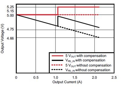 一個(gè)常見(jiàn)的解決方案就是盡可能地將典型值為5.0V的無(wú)負(fù)載輸出設(shè)定電壓提高到5.15V至5.20V(對(duì)于USB 3.0來(lái)說(shuō),最大值為5.25V)。這個(gè)解決方案在最大2.1A電流時(shí)提供足夠(雖然仍舊為最小值)凈空。而對(duì)于更高的負(fù)載電流,這個(gè)方法很快就會(huì)難以支撐。