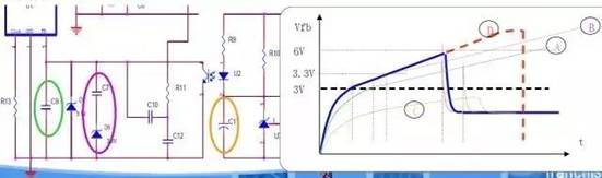 B.由于A方法有不足,將一個(gè)電容(C7)串連穩(wěn)壓管(D6,3.3V)并聯(lián)到反饋腳。此法不會(huì)影響正常工作,如B線所示,當(dāng)Vfb<3.3V時(shí),穩(wěn)壓管不會(huì)導(dǎo)通,分流。上升3.3V時(shí),穩(wěn)壓管進(jìn)入穩(wěn)壓狀態(tài),電容C7開始充電分流,減小后續(xù)Vfb的上升斜率。C。在431的K-A端并聯(lián)一個(gè)電容(C11),電源啟動(dòng)時(shí),C11電壓較低,并由光耦二極管和431的偏置電阻R10進(jìn)行充電。這樣光耦就有較大電流通過,使光耦光敏管阻抗較低而分流,Vfb將緩慢上升,如C線所示。R10×C11影響充電時(shí)間,也就影響輸出的上升時(shí)間。