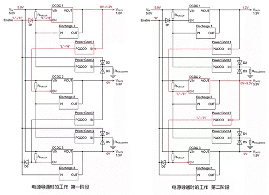 2) 由于DCDC 1的EN引腳通過二極管D1變?yōu)椤癏”,因此DCDC 1啟動(dòng)。