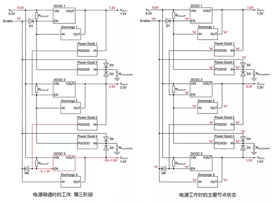 2) DCDC 3的輸出電壓從0V上升到1.5V,至此,三個(gè)系統(tǒng)的電源均處于工作狀態(tài)(電源工作時(shí)的主要節(jié)點(diǎn)狀態(tài)見單獨(dú)給出的圖示)。