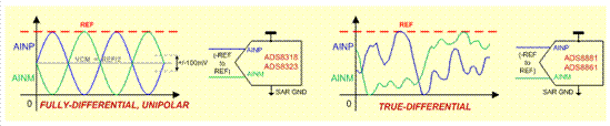 全差分 SAR ADC 支持雙極性輸入和/或多個通道,與單端 SAR ADC 類似。使用變壓器輸出的應(yīng)用可采用全差分輸入 SAR。 |