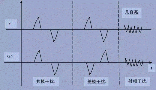 經(jīng)常在實際操作中,對系統(tǒng)損傷很大的都是低頻的共模干擾,譬如大功率電機、斷路器或開關(guān),短路,雷擊感應(yīng)等。這些類型大都是外來的共模信號,其脈寬在數(shù)百us到s之間,周期很長也是數(shù)秒,這樣的脈沖持續(xù)引起對地的高電壓波動,從而損傷系統(tǒng)。但是對于高頻共模干擾,從干擾源開始,大部分能量是以輻射的方式作為能量傳輸途徑的,而且這樣的共模干擾多產(chǎn)生于系統(tǒng)本身。