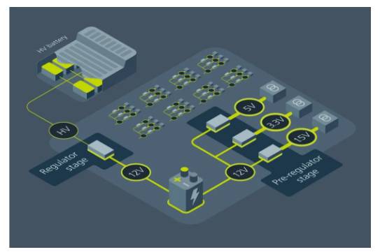 維護(hù)一款 12V 的物理電池,就意味著維護(hù)一個(gè)具有不必要冗余的低效率 PDN。在典型的汽車(chē) 12V PDN 中,所有連接 12V 母線的 12V 負(fù)載都有內(nèi)部前置穩(wěn)壓器,可將寬輸入電壓范圍(通常從 6V 到 16V)轉(zhuǎn)換為 5V、3.3V 或更低電壓。從全球系統(tǒng)角度來(lái)看,無(wú)論是電動(dòng)汽車(chē)、混合動(dòng)力汽車(chē),還是插電式混合動(dòng)力汽車(chē),都有串聯(lián)穩(wěn)壓器冗余。一款從高壓到 12V 的 DC-DC 轉(zhuǎn)換器可為 12V 母線(效率高)穩(wěn)壓,而前置穩(wěn)壓器則可為每個(gè)負(fù)載提供合適的內(nèi)部電壓(圖 1)。