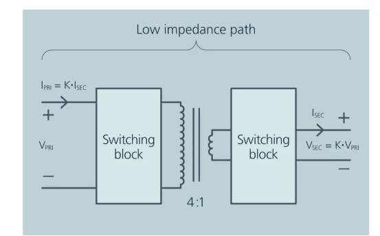 圖 4:BCM 母線轉(zhuǎn)換器的功能框圖。雖然 BCM 可進(jìn)行 DC-DC 轉(zhuǎn)換,但它還可使用變壓器進(jìn)行高效的 AC-AC 轉(zhuǎn)換,不僅可按 K 因數(shù)縮放大小,而且還可使用開(kāi)關(guān)模塊在 AC 與 DC 之間進(jìn)行轉(zhuǎn)換。開(kāi)關(guān)在高頻率下完成,而且由于具有和變壓器一樣的能量傳輸特性,因此轉(zhuǎn)換不僅能對(duì)瞬態(tài)負(fù)載變化做出快速響應(yīng),而且還可在輸入和輸出之間提供一個(gè)低阻抗路徑。