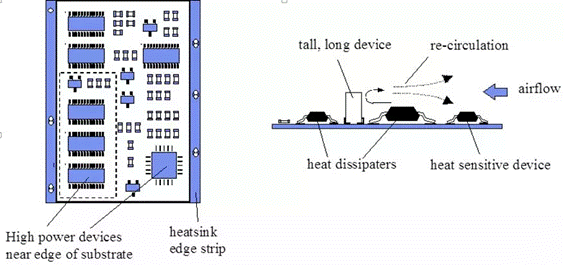 c、同一塊印制板上的器件應(yīng)盡可能按其發(fā)熱量大小及散熱程度分區(qū)排列,發(fā)熱量小或耐熱性差的器件(如小信號晶體管、小規(guī)模集成電路、電解電容等)放在冷卻氣流的最上流(入口處),發(fā)熱量大或耐熱性好的器件(如功率晶體管、大規(guī)模集成電路等)放在冷卻氣流最下游。
