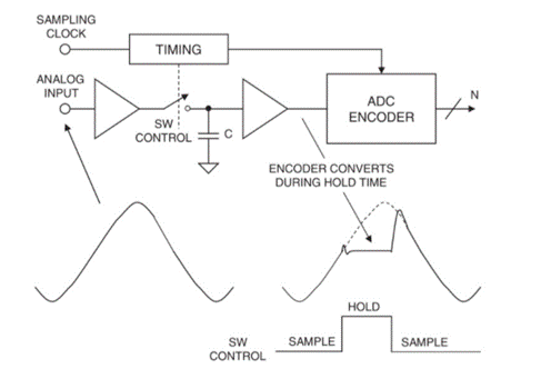 采樣ADC的工作原理:采樣模式下,SHA對信號進行采樣;保持模式期間內(nèi)保持信號恒定。調(diào)整時序,使得后級的ADC編碼器在保持時間內(nèi)對保持的信號進行A-to-D轉(zhuǎn)換,由于保持模式下信號幾乎不變,因此ADC可以處理快速變化的高頻信號,處理的頻率上限不由編碼器決定,而是取決于SHA的孔徑抖動、帶寬和失真等性能。