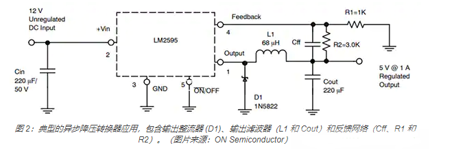 典型的異步降壓轉(zhuǎn)換器應(yīng)用如圖 2 所示。ON Semiconductor 的 LM2595 是一款單片集成電路,包括主電源開(kāi)關(guān)和控制電路。該器件采用內(nèi)部補(bǔ)償,最大限度地減少了外部元器件的數(shù)量并簡(jiǎn)化了電源設(shè)計(jì)。其典型轉(zhuǎn)換效率為 81%,發(fā)熱損耗為占功率的 19%,而同步降壓方案的典型轉(zhuǎn)換效率約 90%,發(fā)熱損耗僅占功率的 10%。這意味著異步降壓轉(zhuǎn)換器的熱損耗幾乎是同步降壓轉(zhuǎn)換器的兩倍。因此,使用同步降壓轉(zhuǎn)換器可以減少發(fā)熱,從而大大簡(jiǎn)化熱管理難題。