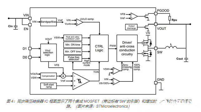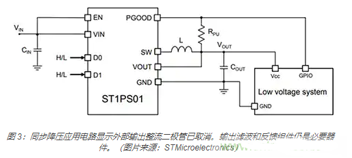 在同步降壓轉(zhuǎn)換器中,如 STMicroelectronics 推出的 ST1PS01 使用同步 MOSFET 整流取代了輸出整流器(圖 3)。相比異步降壓轉(zhuǎn)換器中的輸出整流器,同步 MOSFET 的“導(dǎo)通”電阻較低,可降低損耗,從而顯著提高轉(zhuǎn)換效率。同步 MOSFET 是該 IC 的內(nèi)部組成部分,不需要外部整流二極管。