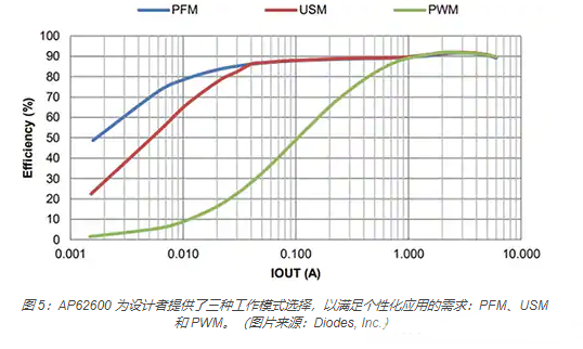 AP62600 提供了三種操作模式供設(shè)計(jì)者選擇,以滿足個(gè)性化應(yīng)用的具體需求(圖 5)。通過(guò)脈沖調(diào)頻 (PFM) 操作,可以實(shí)現(xiàn)所有負(fù)載的高效率。其他可用的模式包括可以獲得最佳紋波性能的脈寬調(diào)制 (PWM),以及可避免輕載時(shí)產(chǎn)生可聞噪聲的超聲波模式 (USM)。