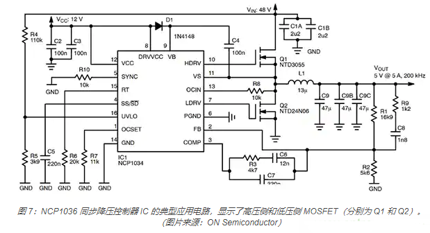 ON Semiconductor 的 NCP1034DR2G 是一款高壓 PWM 控制器,針對(duì)輸入電壓高達(dá) 100 伏的高性能同步降壓 DC/DC 應(yīng)用。該器件設(shè)計(jì)用于嵌入式電信、網(wǎng)絡(luò)和計(jì)算應(yīng)用中的 48 伏非隔離電源轉(zhuǎn)換。NCP1034 驅(qū)動(dòng)一對(duì)外部 N 溝道 MOSFET,如圖 7 所示。