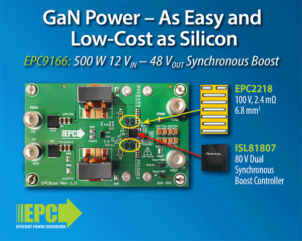 EPC推出基于氮化鎵器件的12 V/48 V、500 W 升壓轉(zhuǎn)換器演示板