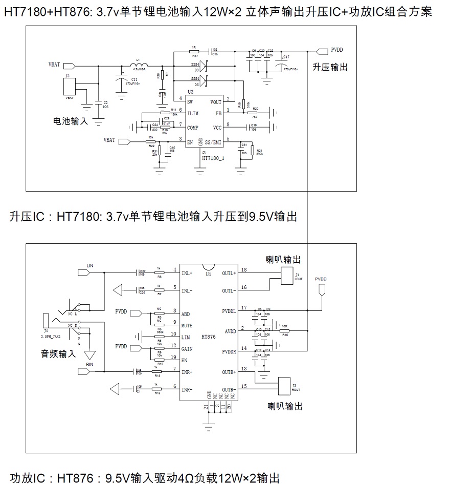 深圳市永阜康科技有限公司推出基于HT876+HT7180的單節(jié)鋰電池3.7V升壓至9.5V、2x12W立體聲升壓音頻放大組合解決方案,無需外圍MOS管、升壓效率最高達90%,外圍簡單、應用方便。
