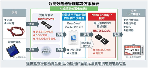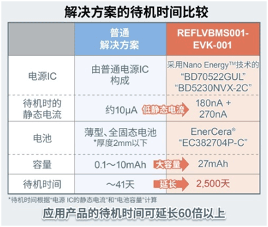 在本解決方案中,搭載超低靜態(tài)電流技術(shù)“Nano Energy™”的電源IC可以更大程度地降低應(yīng)用產(chǎn)品電源部分的功耗,同時,支持各種二次電池的充電控制IC可為各種二次電池提供相匹配的充電。