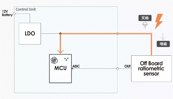 然而,多數(shù)車載傳感器是安裝在與 MCU 分開(kāi)基板上的分離式傳感器。如果在這種布置中的分離式傳感器和 MCU 共享同一電源,連接兩塊板的線束中則會(huì)出現(xiàn)不必要的電源短路和接地短路故障,導(dǎo)致MCU損壞的可能性發(fā)生(參見(jiàn)圖 2)。