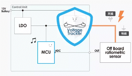 電壓跟蹤器可將分離式傳感器的電源與 ECU 的電源分開(kāi),還配備了保護(hù)功能,以保護(hù) MCU 免受由電源短路和接地短路故障導(dǎo)致的不必要損壞(參見(jiàn)圖 3)。