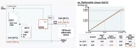 假設(shè)只有分離式傳感器的電源電壓(「LDO2」 輸出電壓)因溫度變化而從 5.0V 下降到 4.9V。當(dāng)電源電壓為5.0V時(shí),分離式傳感器的輸出信號(hào)在0mT時(shí)為2.50V,但因輸出與電源電壓成比例而下降至2.45V。因此,從 「LDO1」 接收相同的 5.0V 參考電壓的 ADC 在讀取分離式傳感器信號(hào)時(shí)出現(xiàn)讀取錯(cuò)誤!窵DO1」 的輸出電壓出現(xiàn)波動(dòng)時(shí)也會(huì)出現(xiàn)相同的結(jié)果。
