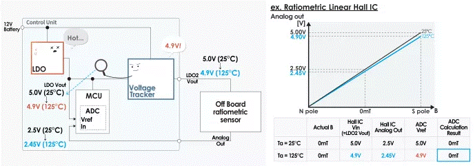 以下示例描述了使用 LDO(Low Drop Out)穩(wěn)壓器為分離式傳感器供電時(shí),與使用電壓跟蹤器相比,對(duì)分離式傳感器(Ratiometric Linear Hall IC)讀數(shù)精度的影響。