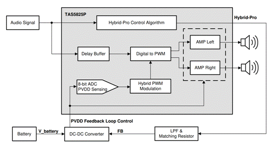 為了在不影響輸出功率的情況下提高效率,TI推出了在DSP中采用Hybrid-Pro算法的TAS5825P D類音頻放大器,該放大器通過連續(xù)分析輸入的音頻信號并向外部直流/直流轉(zhuǎn)換器提供脈寬調(diào)制反饋,可提高系統(tǒng)效率并降低沒必要的損耗。利用反饋,直流/直流轉(zhuǎn)換器可在音頻峰值需要時增大電源電壓,并在不需要更高的輸出功率時降低電源電壓。該功能可在低音量播放音頻時降低功耗并提高效率,同時不會限制放大器提供最大輸出功率的能力。圖1顯示了TAS5825P的方框圖。