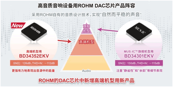 通常認為,DAC芯片是決定音響設(shè)備音質(zhì)的最重要器件之一,因為需要從高分辨率數(shù)字音源數(shù)據(jù)中更大程度地提取信息并將其轉(zhuǎn)換為模擬信號。一直以來,ROHM的音頻產(chǎn)品開發(fā)都非常注重音質(zhì)。例如,基于50年來的音頻IC產(chǎn)品開發(fā)經(jīng)驗,建立了可充分提取音源信息的“音質(zhì)設(shè)計技術(shù)”,并推出了高音質(zhì)的聲音處理器IC和高音質(zhì)的音響電源IC等。其中,作為旗艦機型開發(fā)的“MUS-IC™”系列中的DAC芯片“BD34301EKV”,其音質(zhì)效果獲得高度好評,目前已在世界范圍內(nèi)被廣泛應(yīng)用?蛻魧τ诳捎糜诟鼜V泛的音響設(shè)備的高端機型用DAC芯片的需求不斷增加,為滿足客戶需求,ROHM此次又開發(fā)出“BD34352EKV”。
